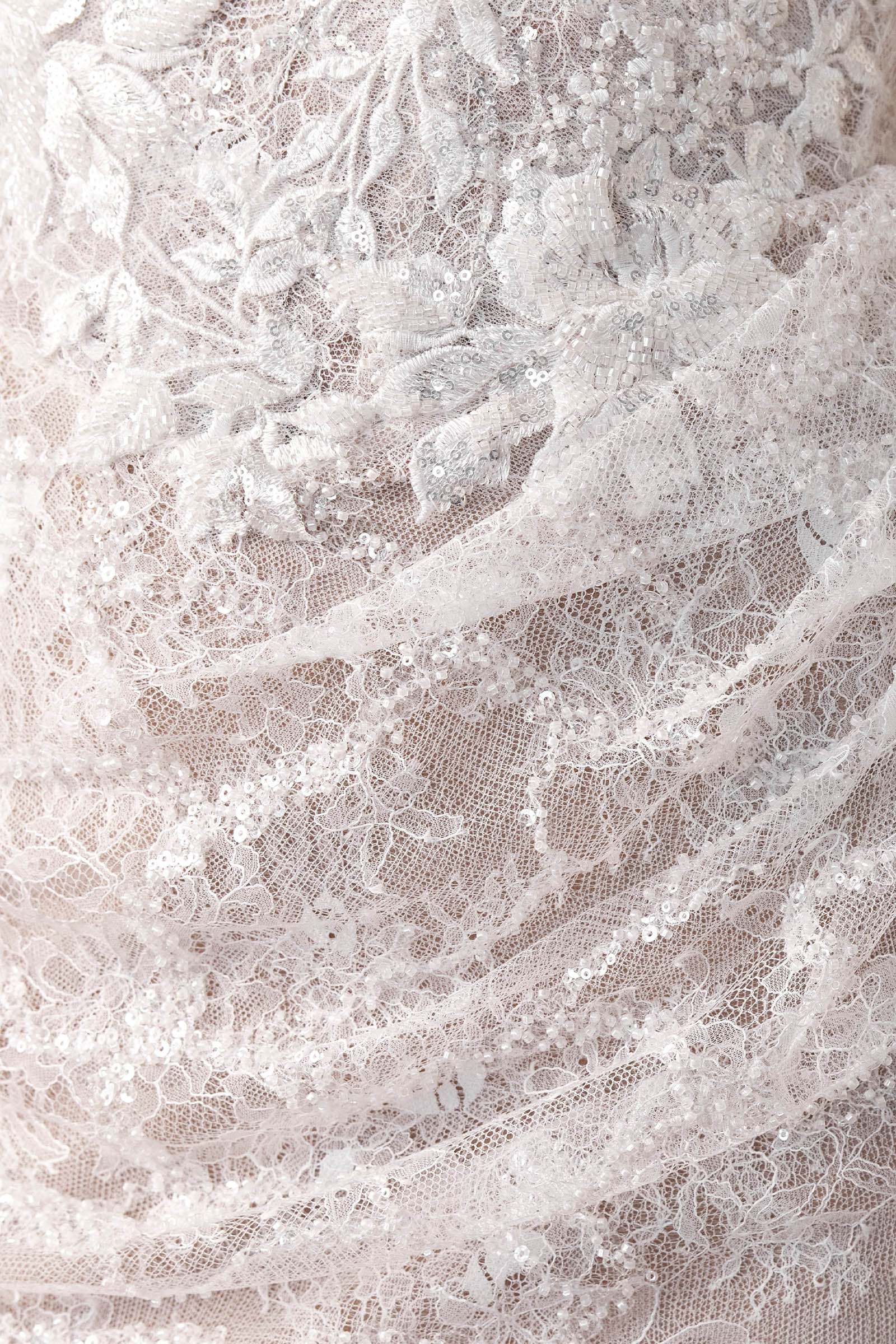 • Double-layer lace with unique abstract beading and delicate Chantilly lace
