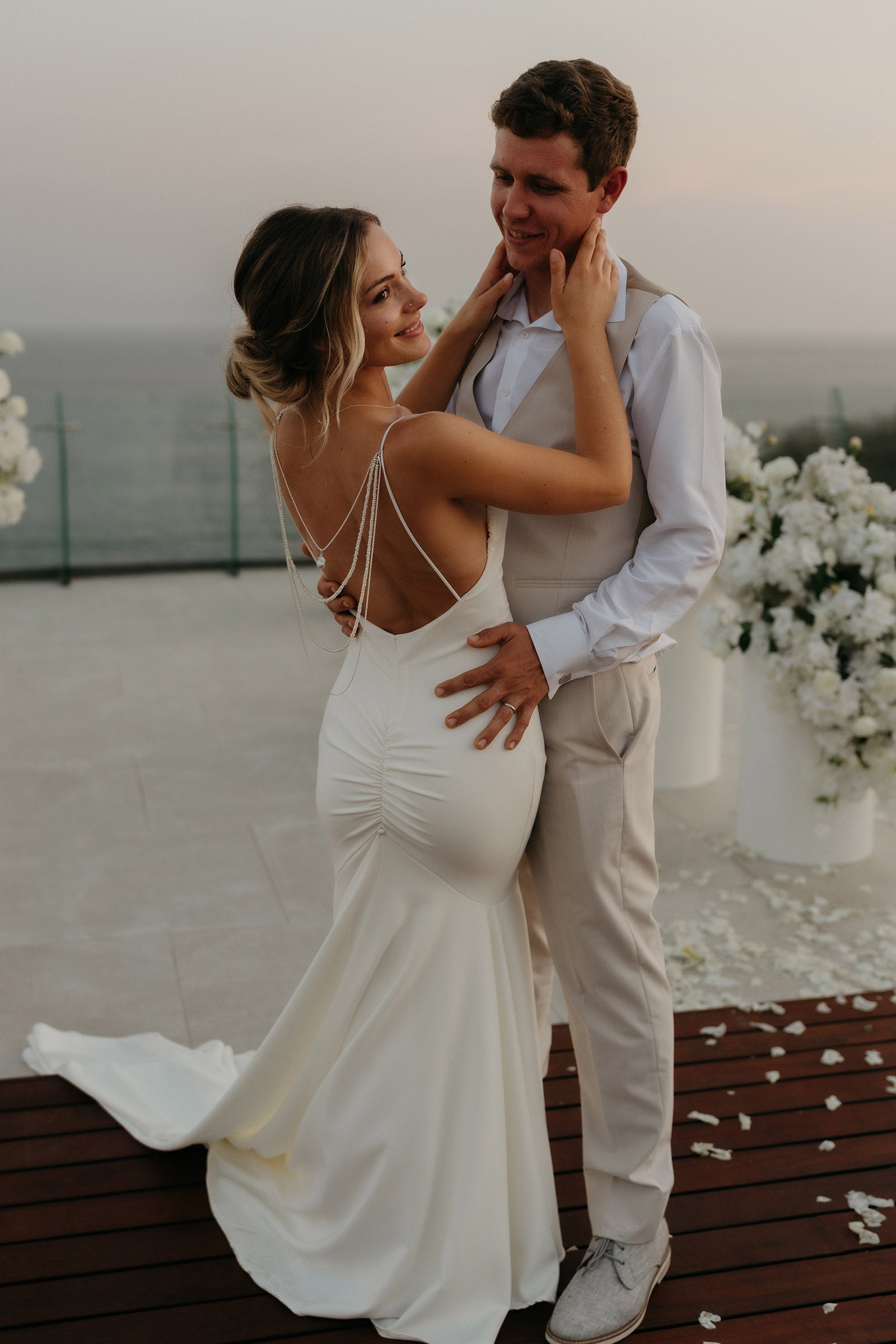 • I loved feeling free and flowy. I didn’t want to feel constricted or heavy in a wedding gown and my dress made me feel so comfortable. The delicate detail in the lace of the gown was beautiful and I love that it was made to fit my body and I didn’t have to stress about gaining or losing weight before my wedding and needing last minute alterations.