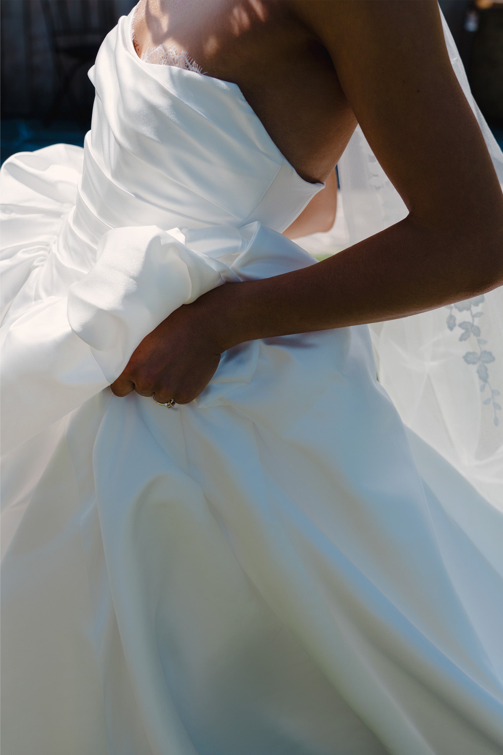 Vittoria was made to make an entrance. A Basque-waist wedding dress designed to feel timeless beyond trends, she’s crafted from our luminous Mikado satin – a contemporary, glossy fabrication with a rich, weighted drape for an elevated finish. Structured yet soft to the touch, the fabric holds, flatters, and moves with ease, giving Vittoria her signature balance of drama and effortlessness.